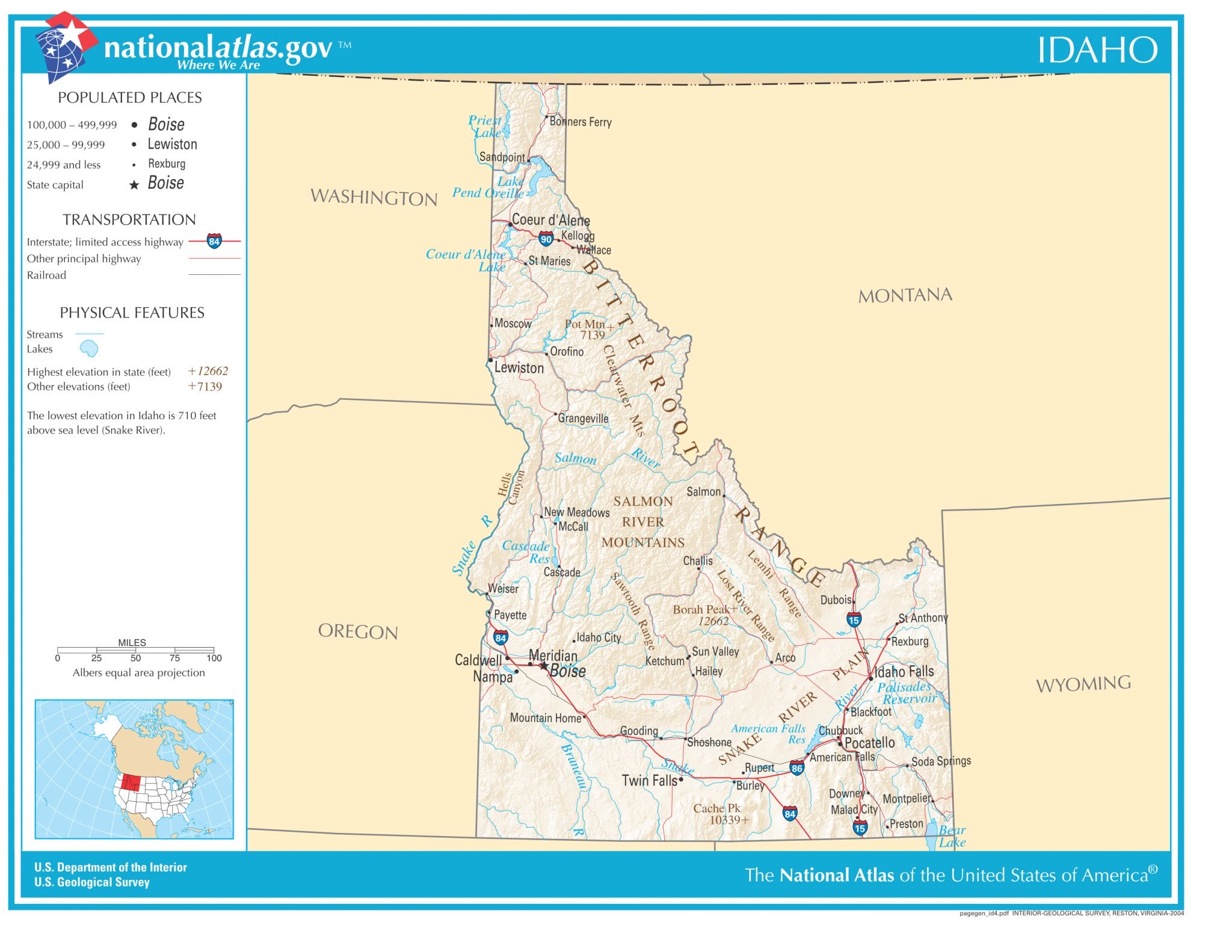 Idaho grenzt an die kanadische Provinz British Columbia sowie an die US-Bundesstaaten Montana, Wyoming, Utah, Nevada, Oregon und Washington. Die wichtigsten Religionen sind die Mormonen, die Katholiken, die Mitglieder der Assemblies of God sowie die Methodisten. Flächenmäßig ist Idaho etwas kleiner als Großbritannien und belegt in diesem Punkt Rang 14 unter allen US-Bundesstaaten.