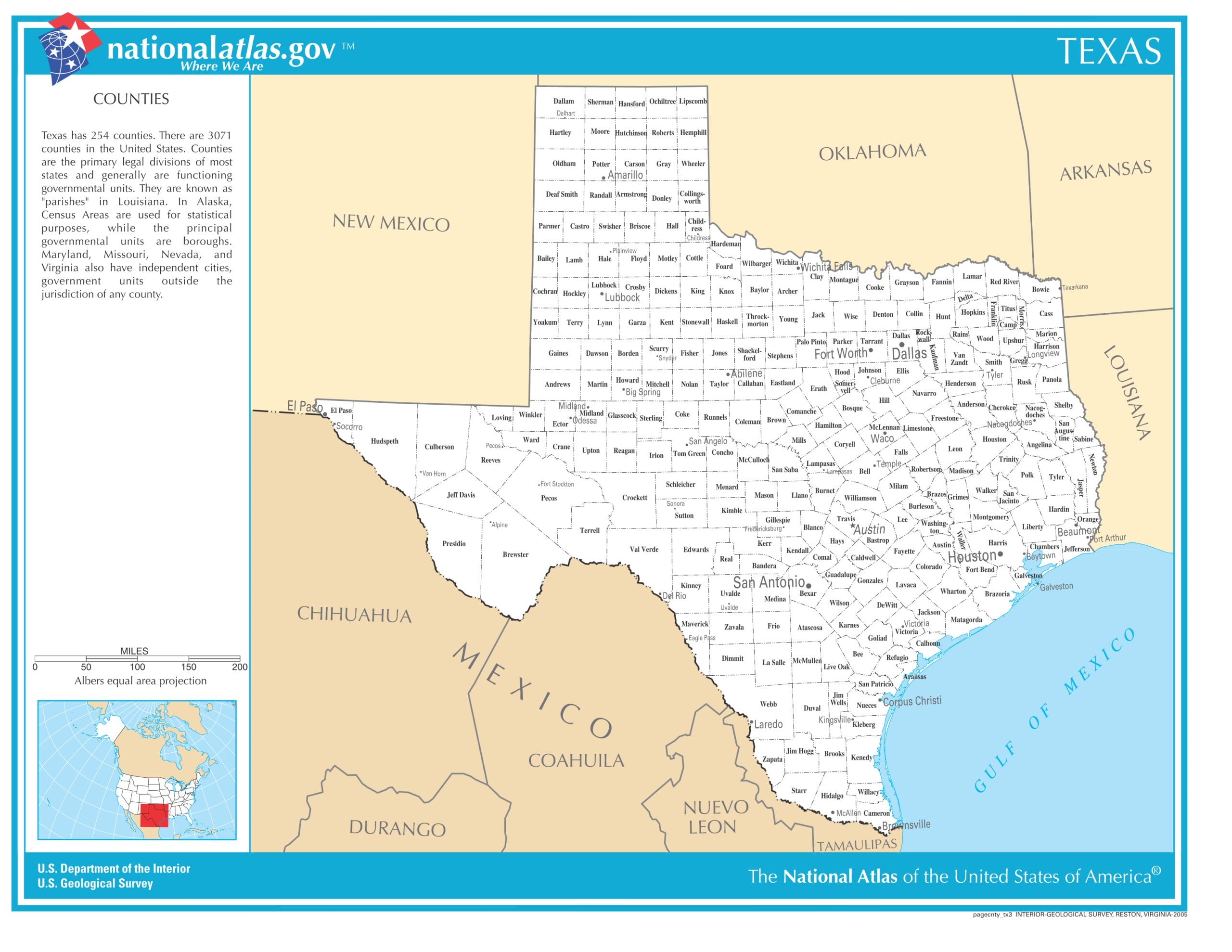 Der Bundesstaat Texas ist in Countys eingeteilt. Im Vergleich zu den anderen Bundesstaaten hat Texas die meisten Countys der USA. Es sind insgesamt 254 Stück. Houston ist die größte Stadt in Texas. Sie liegt im Südosten des Staates und kann auf der Karte oben fast gar nicht übersehen werden. Die zweitgrößte Metropole von Texas ist San Antonio, sie liegt ebenfalls im Süden. Ganz anders ist das bei Dallas, der drittgrößten Stadt von Texas, und Fort Worth. Sie sind beide im Nordosten der Texas-Karte zu finden.