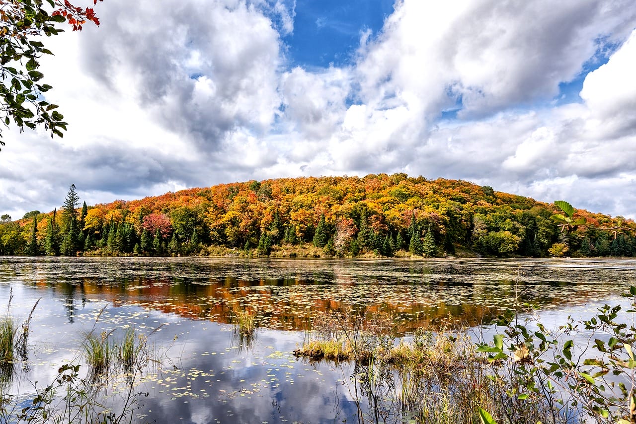 - Im Laurentides Provincial Park befinden sich mehr als 2.000 Seen. Sie bieten die Gelegenheit zum Angeln und zu weiteren Aktivitäten. Im Wasser spiegeln sich die Bäume mit ihrem bunten Laub.