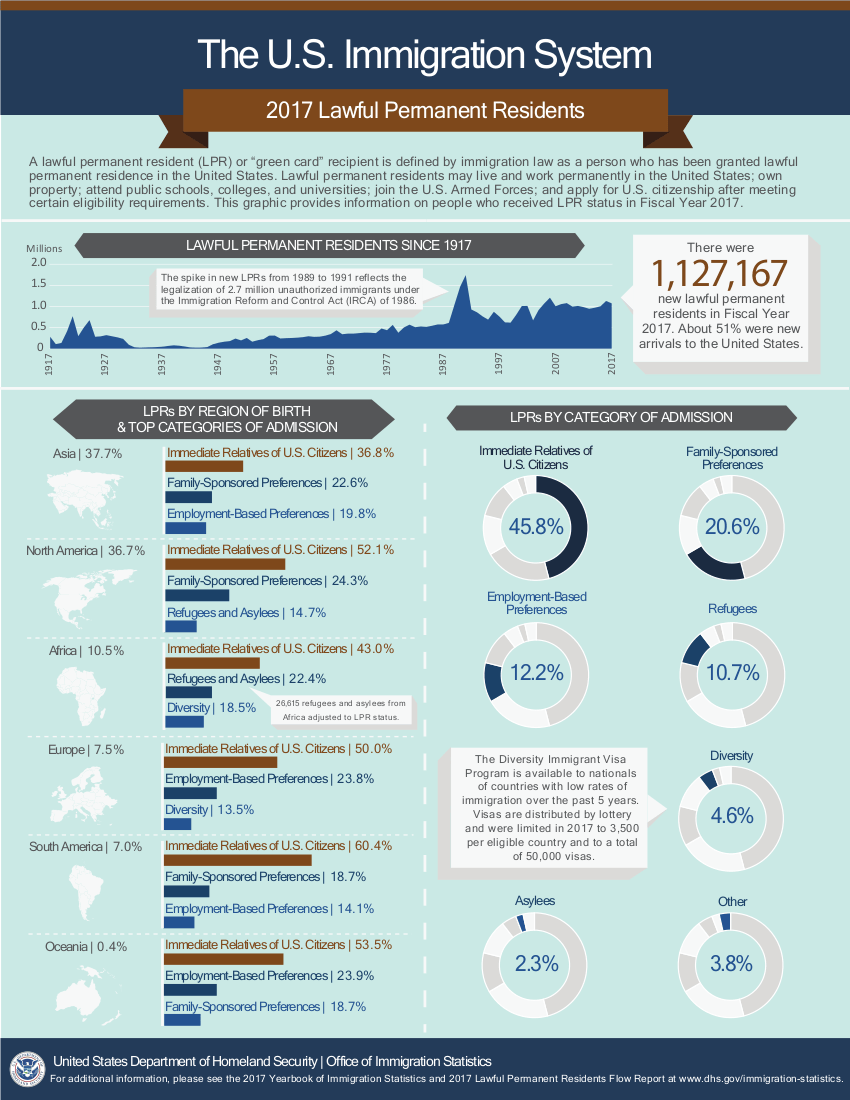 1994 wurde zum ersten Mal die Green Card Lotterie durchgeführt, mit der jedes Jahr 55.000 Teilnehmer auf der ganzen Welt per Losfahren ausgewählt werden, in den USA ein neues Leben zu beginnen. Mit dieser unbeschränkten Aufenthalts- und Arbeitsgenehmigung soll eine multikulturelle Einwanderung und die kulturelle Vielfalt in den USA gefördert werden. Das „Deferred Action for Childhood Arrivals Programm (Daca)“ ermöglicht eine Besserstellung von Kindern illegaler Einwanderer, die zum Zeitpunkt der Einwanderung jünger als 16 Jahre waren. Sie erhalten eine Aufenthaltserlaubnis und Schulbildung, obwohl sie keine gültigen Papiere haben.
