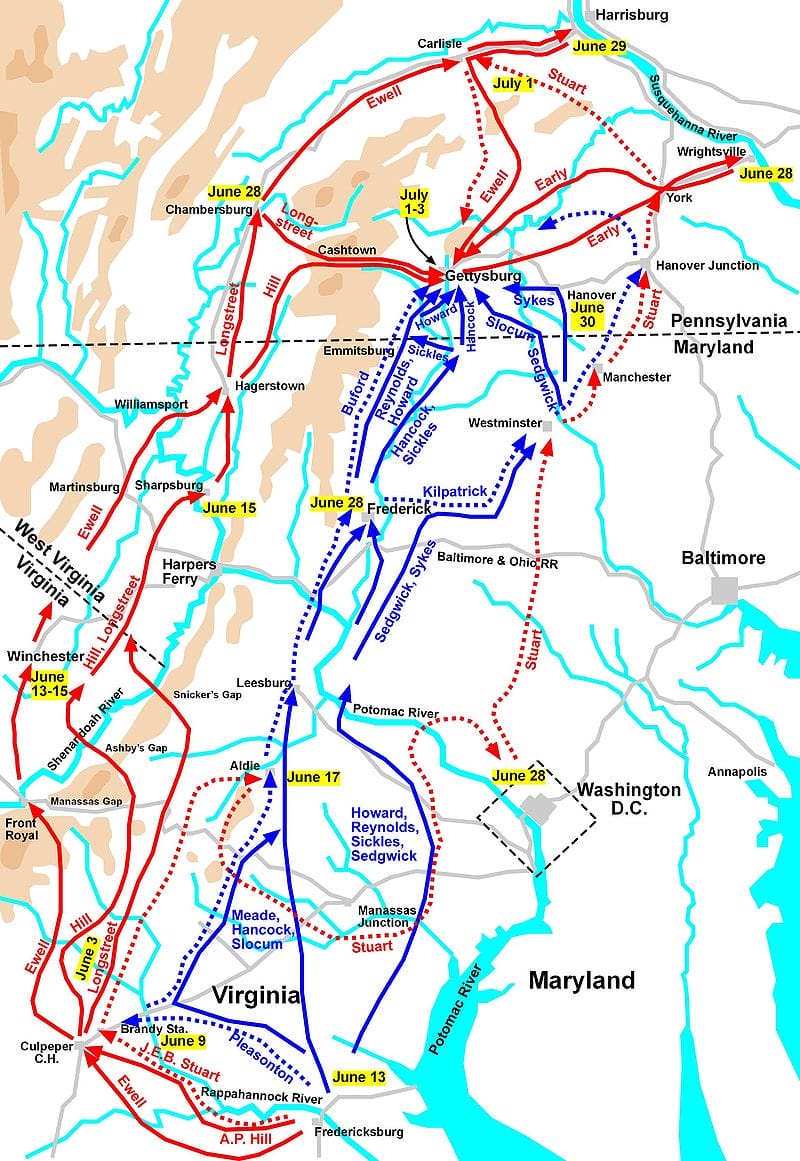 General Lee verzichtete auf die Überquerung des Susquehanna und verfolgte danach den Plan, mit seinen 75.000 Soldaten in den von der Union beherrschten Bundesstaat Pennsylvania einzumarschieren. Seine Hoffnungen basierten auf Überlegungen, die Potomac-Armee der Nordstaaten hinter sich her zu ziehen und Washington darauf den Frieden nach den Vorstellungen der Konföderierten diktieren zu können.