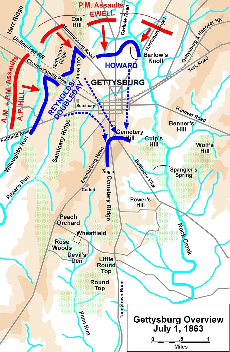 Der 1. Juli 1863 war der Tag, der die Schlacht von Gettysburg eröffnete. Die Brigaden der Konföderierten Staaten erreichten die Höhenzüge im Nordwesten der Stadt zu einer sehr frühen Stunde. Wenig später entbrannten die ersten Gefechte, die auf beiden Seiten zu großen Verlusten führten. Es entwickelte sich ein zähes Ringen mit dem Ziel, Gebiete zu gewinnen.