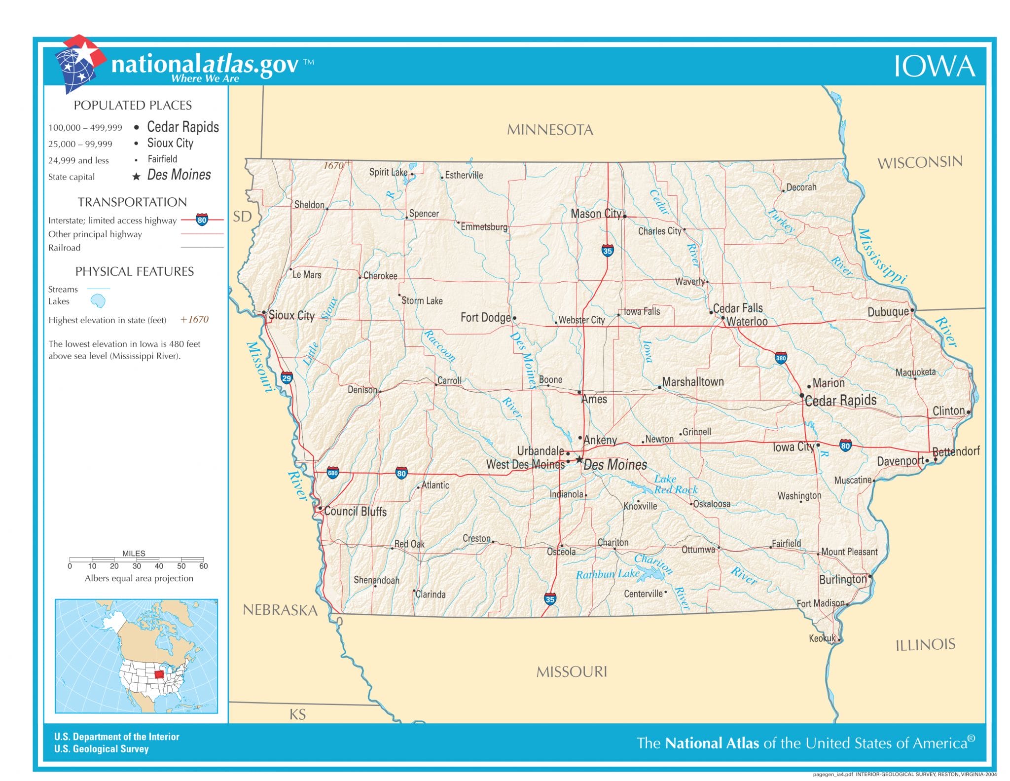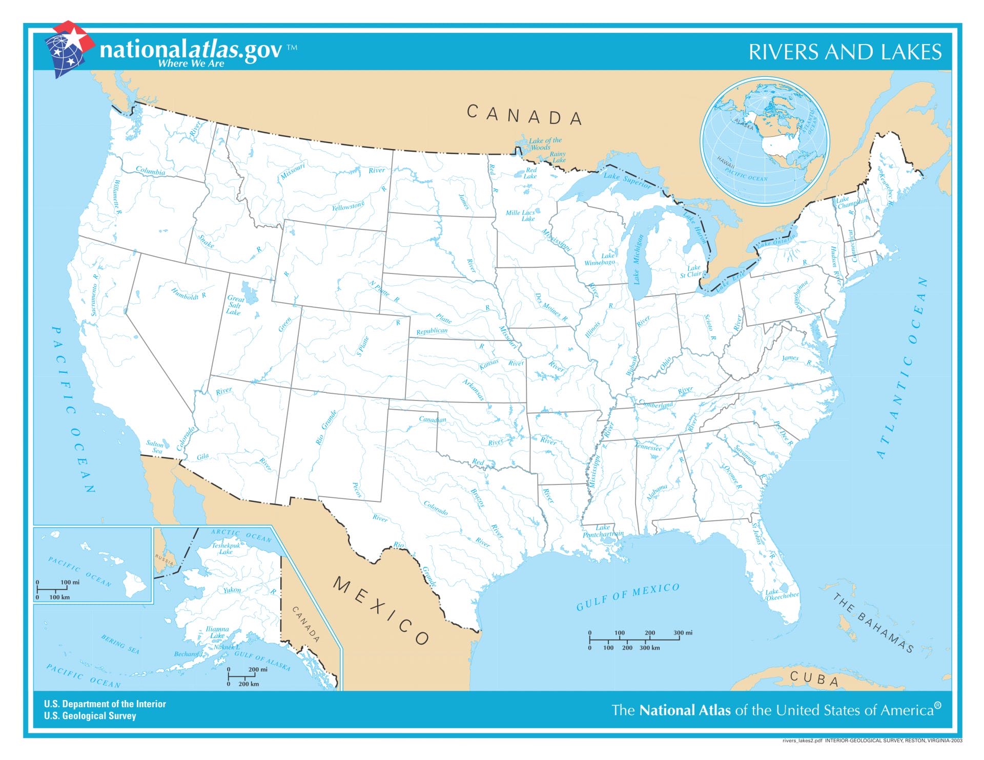 USA Karte mit Flüssen und Seen