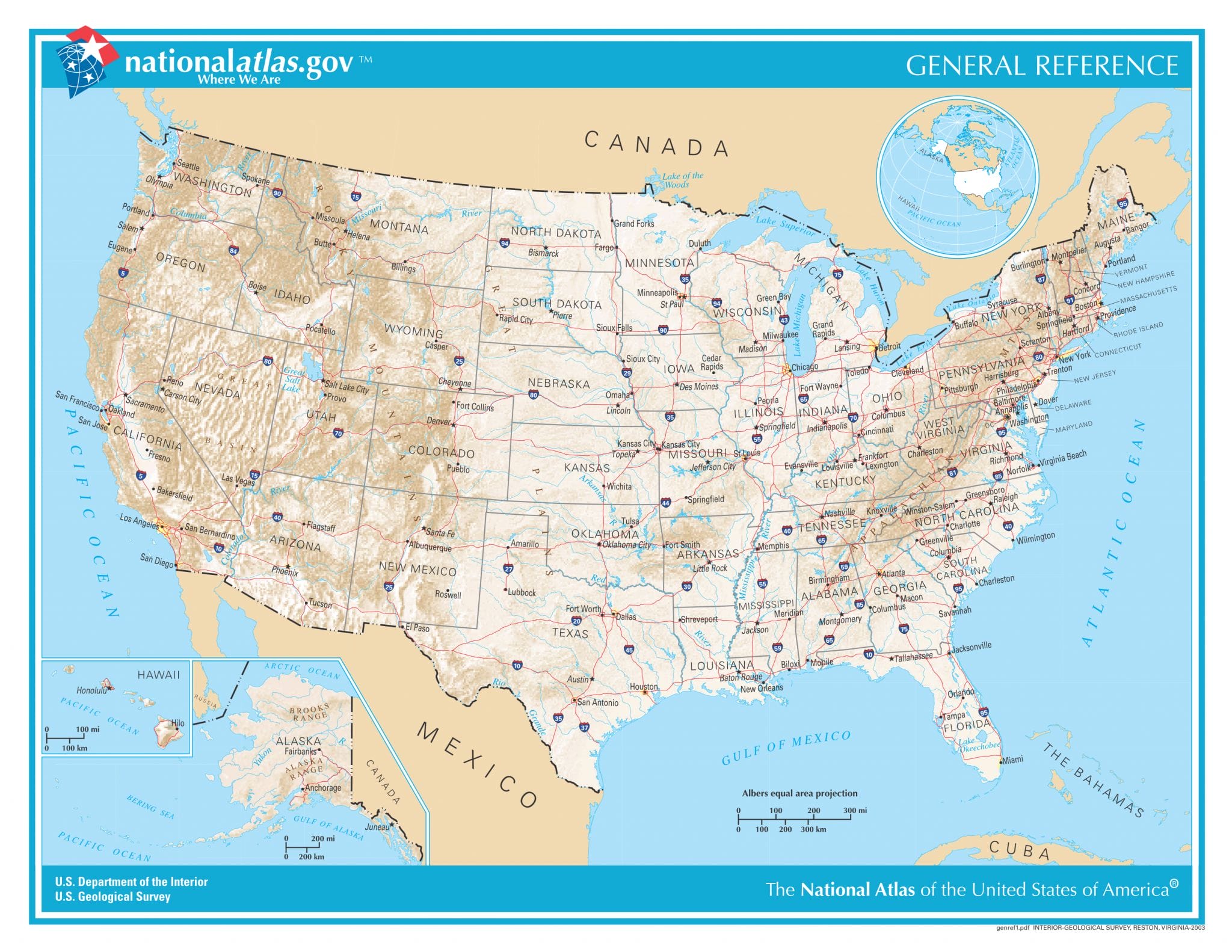 Hier erhaltet ihr einmal die USA Karte mit den 50 Bundesstaaten. Außerdem präsentieren wir euch Kartenmaterial mit den jeweiligen Hauptstädten, eine Reliefkarte und eine USA Karte mit den Flüssen und Seen des Landes.
