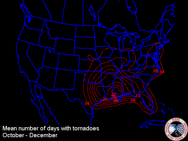 Tornados in der Region des Tornado Alleys treten typischerweise im späten Frühling und gelegentlich im frühen Herbst auf. Das Gebiet der Golfküste hat ein eigenes Tornado-Maximum, das den Spitznamen „Dixie Alley“ trägt und im späten Herbst (Oktober bis Dezember) eine relativ hohe Frequenz an Tornados aufweist.